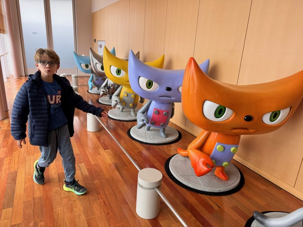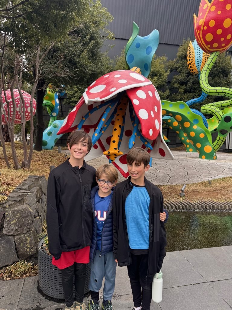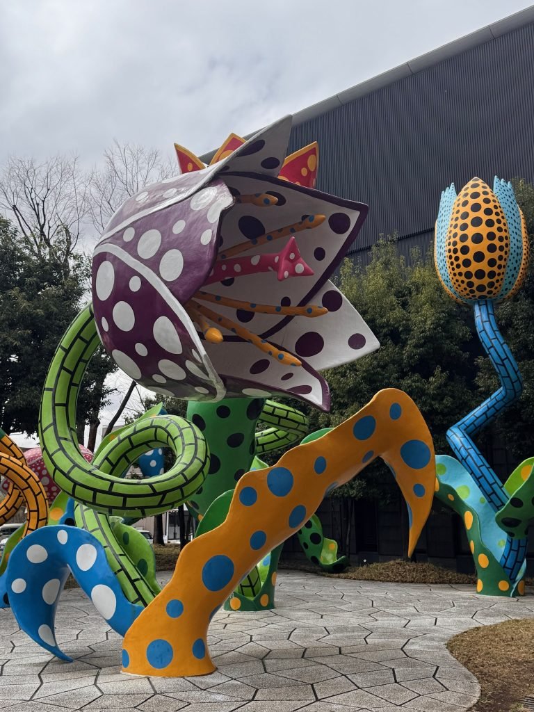 On the 26th of March we went to the Matsumoto Art Museum. When we got to the museum we saw giant curly and colorful flowers made of stone. When we got inside we went up some stairs and went to the Yayoi Kusama art exhibit. The first thing we saw was a chandelier with tons of mirrors around it so it looked like it was going on forever. After that we saw a ladder with a mirror at the top and the bottom of it so it looked like it was going on forever. Then we saw some lights that were shaped in a heart that kept getting dimmer so it looked like it was 3 dimensional. We then went into a room with mirrors as walls that had tons of light s hanging from thin ropes so it looked like it was going on forever in every direction. After that exhibit we went to a gallery of paintings that were by various artists from the area. One of the paintings we saw had hills in Granada painted in it. Granada is an area in Spain that we went to earlier in this trip and we have a post about it.