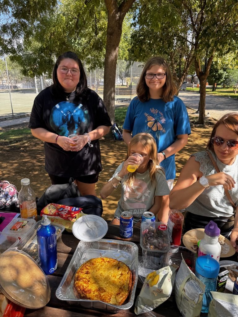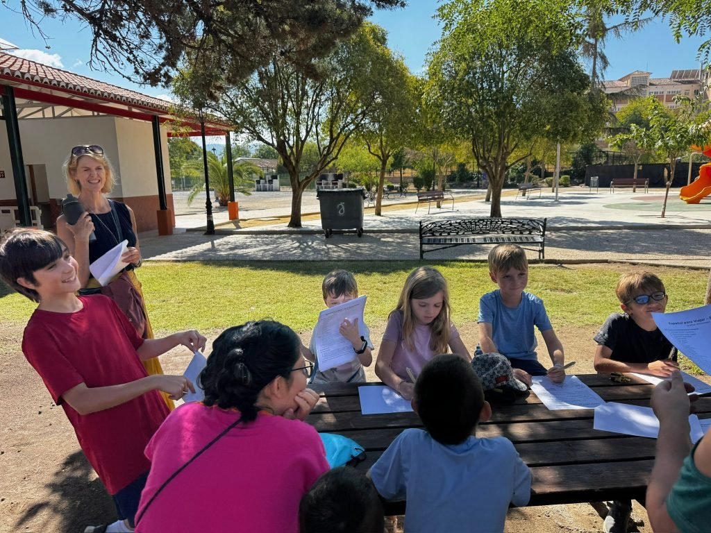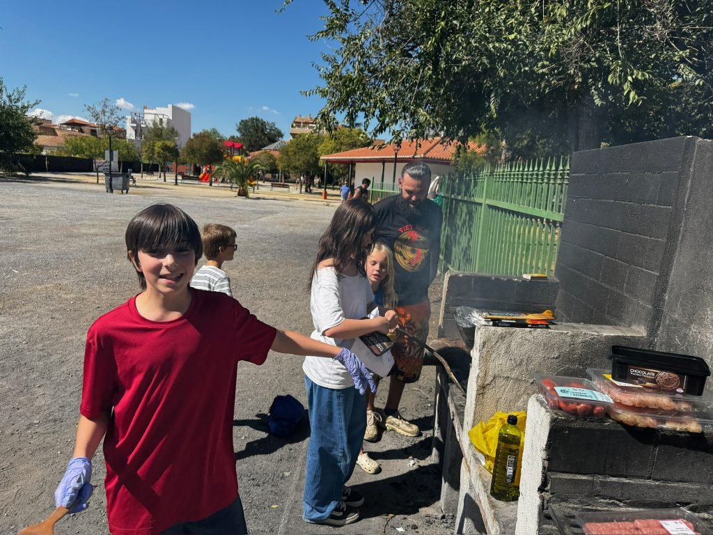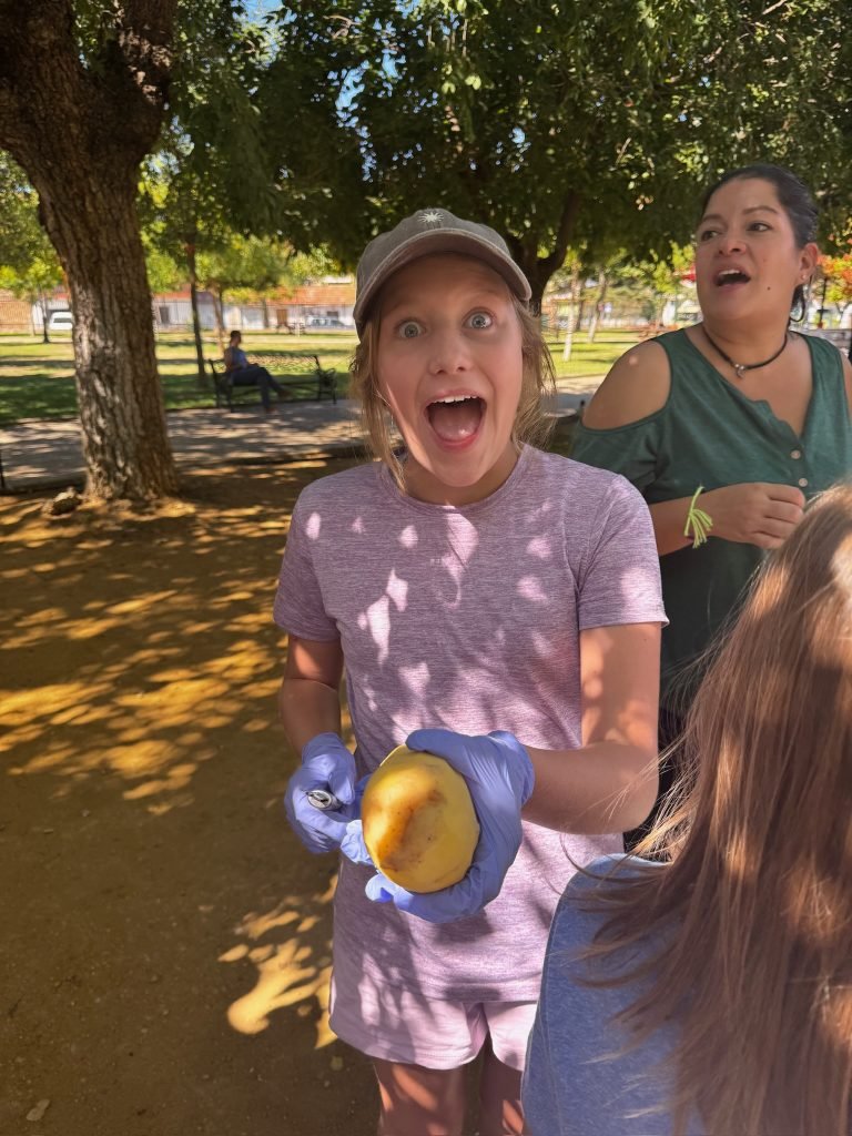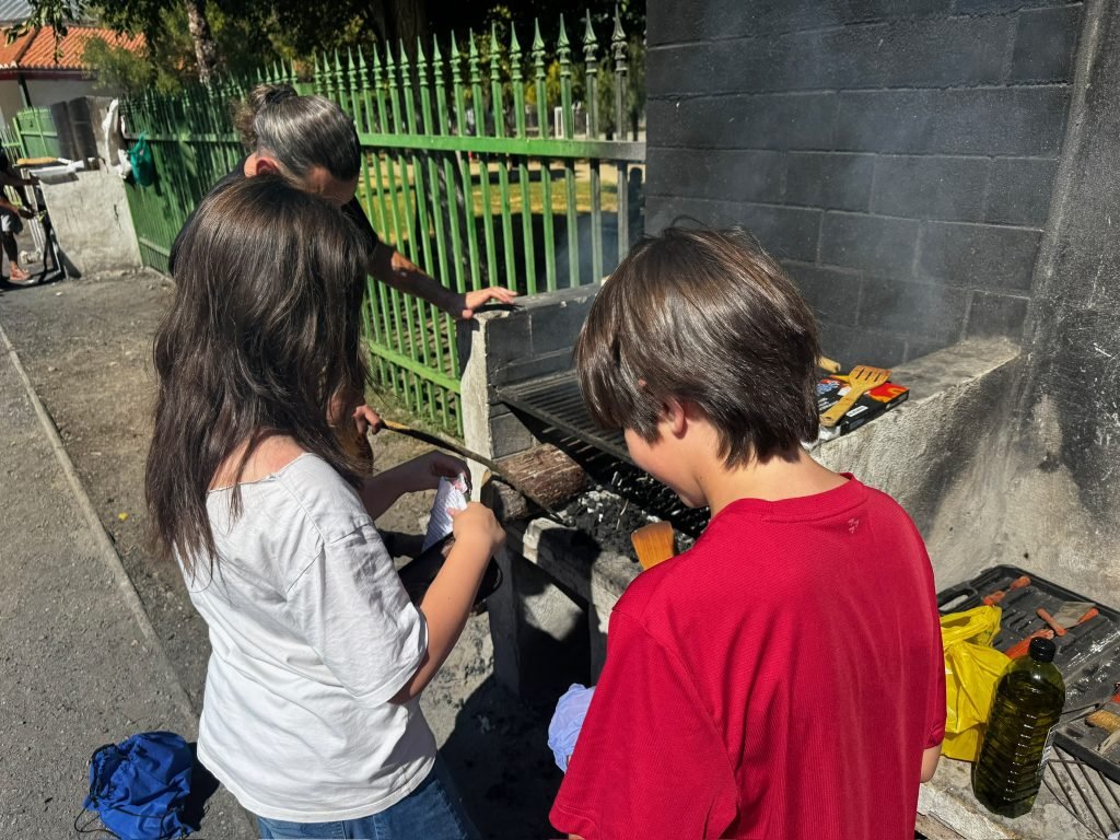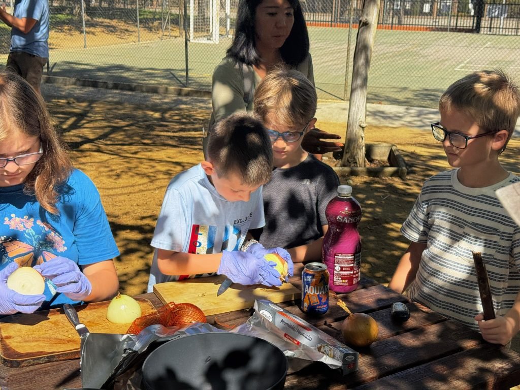 After class we played on the playground. It was made for little kids so we hit our head A LOT. We peeled and cut potatoes and onions while some people cut carrots. We were making Spanish tortillas. Finn was helping with this while one girl threw her spanish paper in the flames to make it grow faster. When it was done we had a schmorgashborg. Once we were done eating we had a Kids VS Grownups soccer / Futball / Futbol. And somehow the kids won! Then some kids clogged the water fountain with “poop”.