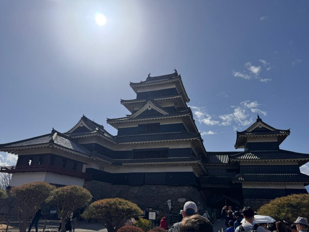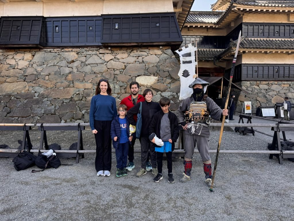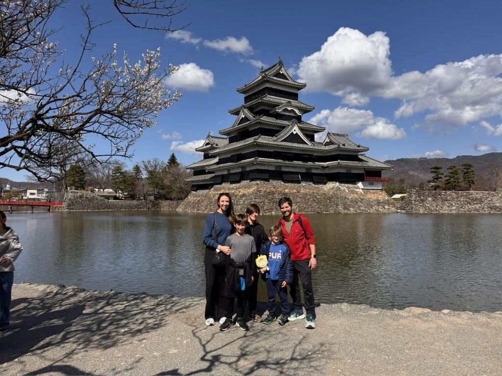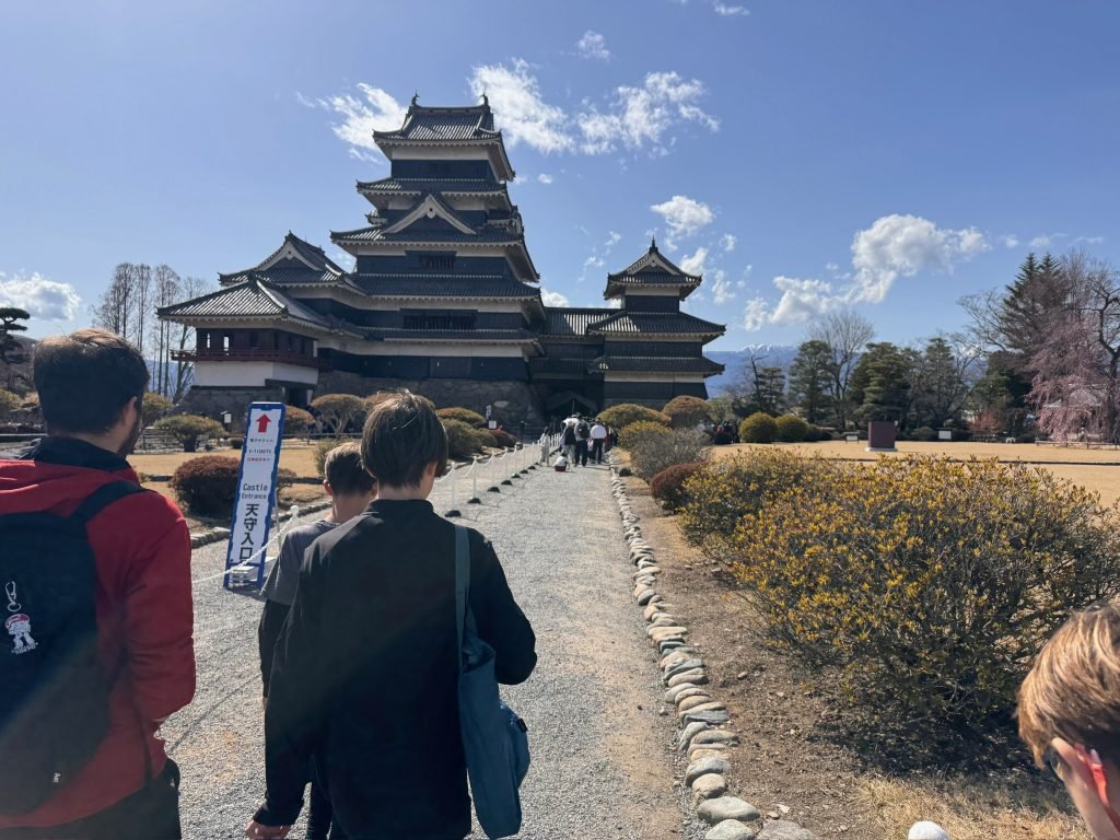On the 27th of March we went on a tour of Matsumoto castle. We had to wait in a very long line because it was spring break and the cherry blossoms are blooming so there were a lot of people. When we went inside our tour guide told us about how the Americans invaded Japan and modernized it so instead of using swords they used guns. When we finally got into the castle we saw lots of guns and cannons. In some areas there were katanas, bows, and samurai armor but most of it was guns and other modern weapons. Our tour guide also told us that the walls were black to scare the enemy and because they used a special sap from certain trees that made it so it wouldn’t burn down as quickly or at all. After the castle we went to a dojo like where the samurai used to practice. While we were there our sensei thought us many techniques like how to unsheathe the sword properly and 3 different ways to attack. There was the horizontal strike, the diagonal strike, and the vertical strike. While we were practicing we got to wear traditional Japanese robes.Another thing she taught us was how to sheath our sword properly because after a battle you might be a little shaky so the way she taught us to sheath our blade makes it so we won’t cut ourselves. After the samurai experience we went to an indoor archery class where they taught us how to use a traditional Japanese longbow. When we got there Nate tried out the shorter bow and he made 5 targets. Finn was also good at using the Japanese longbow and made 3 targets. The longbow is harder to use since the grip is slightly further down and we are not used to doing that. While we were shooting arrows Wells and our tour guide were making paper throwing stars. When we finished our tour the tour guide recommended a few restaurants and dessert stores that he liked. At the end of the day Finn and our dad went ton a run as usual.